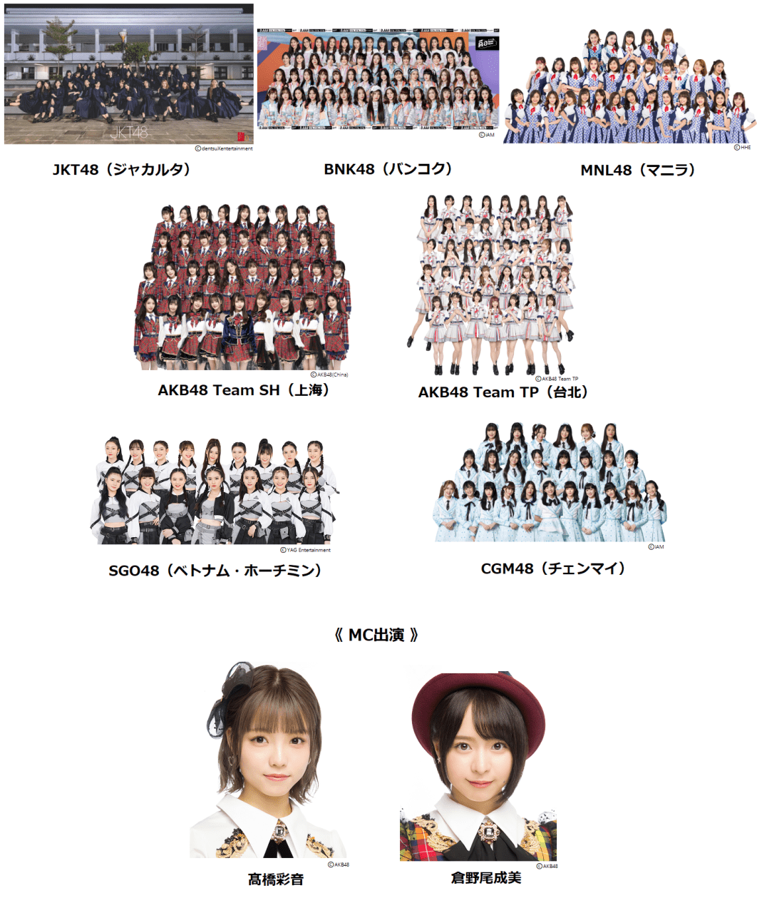 JKT48, BNK48, MNL48, AKB48 Team TP, SGO48 , AKB48 Team SH, CGM48